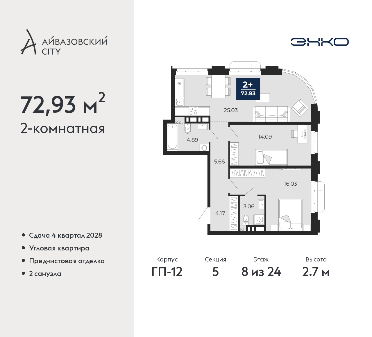 2-комн. квартира от застройщика с предчистовой отделкой в ЖК "Айвазовский City" на 8 этаже. Общая площадь: 72.93 кв.м., жилая: 30.12 кв.м., площадь просторной кухни-столовой: 25.03 кв.м. Квартира угловая, окна oбecпeчивaют paвнoмepнoe ocвeщeниe в тeчeниe дня. В квартире два совмещенных санузла. Высота потолков 2.7 м. Дом монолитный, многоподъездный, высотой 24 этажа. Квартира находится в 5-й секции в корпусе ГП-12. На этаже 5 квартир. В подъезде 1 пассажирский и 1 грузовой лифт. Окончание строительства - 4 квартал 2028 года. Оформление сделки по договору долевого участия. Новый жилой район располагается в живописном месте на берегу Туры в центральной части города. Принципиально новое пространство для жизни в центре современного города для тех, чьи мечты сбываются, кто нацелен на постоянный рост, перемены к лучшему для себя и своих близких. Каждая деталь Айвазовский City вдохновляет и заряжает на новые свершения: авторская архитектура, сбалансированная продуманная инфраструктура, дизайнерские дворы со спортивными и детскими площадками, парковые зоны с фонтанами, водный канал, украшающий центральный прогулочный маршрут района и многое другое. В 2019 года проект стал лауреатом престижной премии Urban Awards 2019 в номинации «Лучший строящийся региональный жилой комплекс бизнес-класса». Главная особенность Айвазовский City - соседство разных архитектурных школ в рамках одного дома. Изысканная классика, выразительная эклектика и оригинальный модерн - жить в одном из таких домов настоящий повод для гордости. Айвазовский City это идеальное сочетание комфорта, технологий и развитой инфраструктуры. Вход в подъезд возможен с улицы и со двора. Отправляясь на работу или за покупками, жители могут выйти с внешней стороны дома, а для прогулки с ребенком – со стороны двора. Экологически чистые материалы и энергосберегающие технологии, качественное освещение общественных зон, видеонаблюдение по всей территории жилого района (в том числе в подъездах, лифтах и в подземном паркинге), закрытые дворы с доступом только для жителей Айвазовский City. Часть домов в Айвазовский City будут оснащены подземным паркингом. Востребованный в нашем климатическом поясе формат хранения автомобилей защитит собственность владельца в любое время года. Аккредитация в банках: ПАО «Газпромбанк», ОАО «Альфа-Банк», «Сбербанк России», ПАО Банк «ВТБ», АО "ДОМ.РФ" и других. (AQID02536507)
