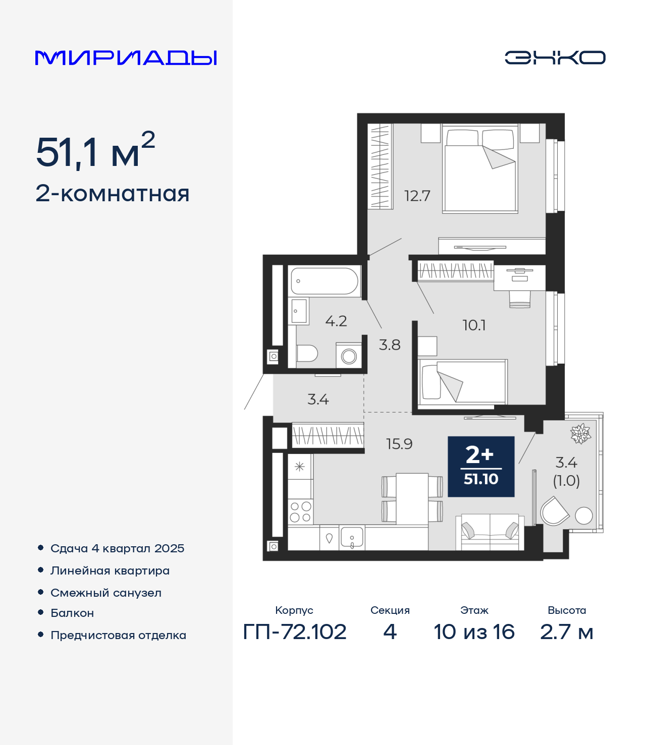 Двухкомнатная квартира от застройщика с предчистовой отделкой в ЖК "Мириады" на 10 этаже. Общая площадь: 51.1 кв.м., жилая: 22.8 кв.м., площадь просторной кухни-столовой: 15.9 кв.м. Комнаты изолированные, все окна выходят на одну сторону. В квартире один балкон, один совмещенный санузел. Высота потолков 2.7 м. Дом монолитный, многоподъездный, переменной этажности, от 14 до 16 этажей. Квартира находится в 4-й секции высотой 16 этажей в корпусе ГП-72.102. На этаже 6 квартир. В подъезде 1 пассажирский и 1 грузовой лифт. Окончание строительства - 1 квартал 2026 года. Оформление сделки по договору долевого участия. Вселенная бесконечных историй. Ранее невиданный Тюмени масштаб: территория 240 гектаров и 1 650 000 м² застройки. Мириады – это город масштабных перемен и больших возможностей. Город зеленых рощ и зеркальных озер. Город для работы, учебы и развлечений. Город для детей и их родителей. Город для всех и каждого. Проект расположен в районе Мыс рядом с ТРЦ «Тюмень Сити Молл» в границах улицы Тимофея Чаркова, Тобольского тракта и объездной дороги. Срок полного освоения территории - до 2034 года. (AQID02536556)
