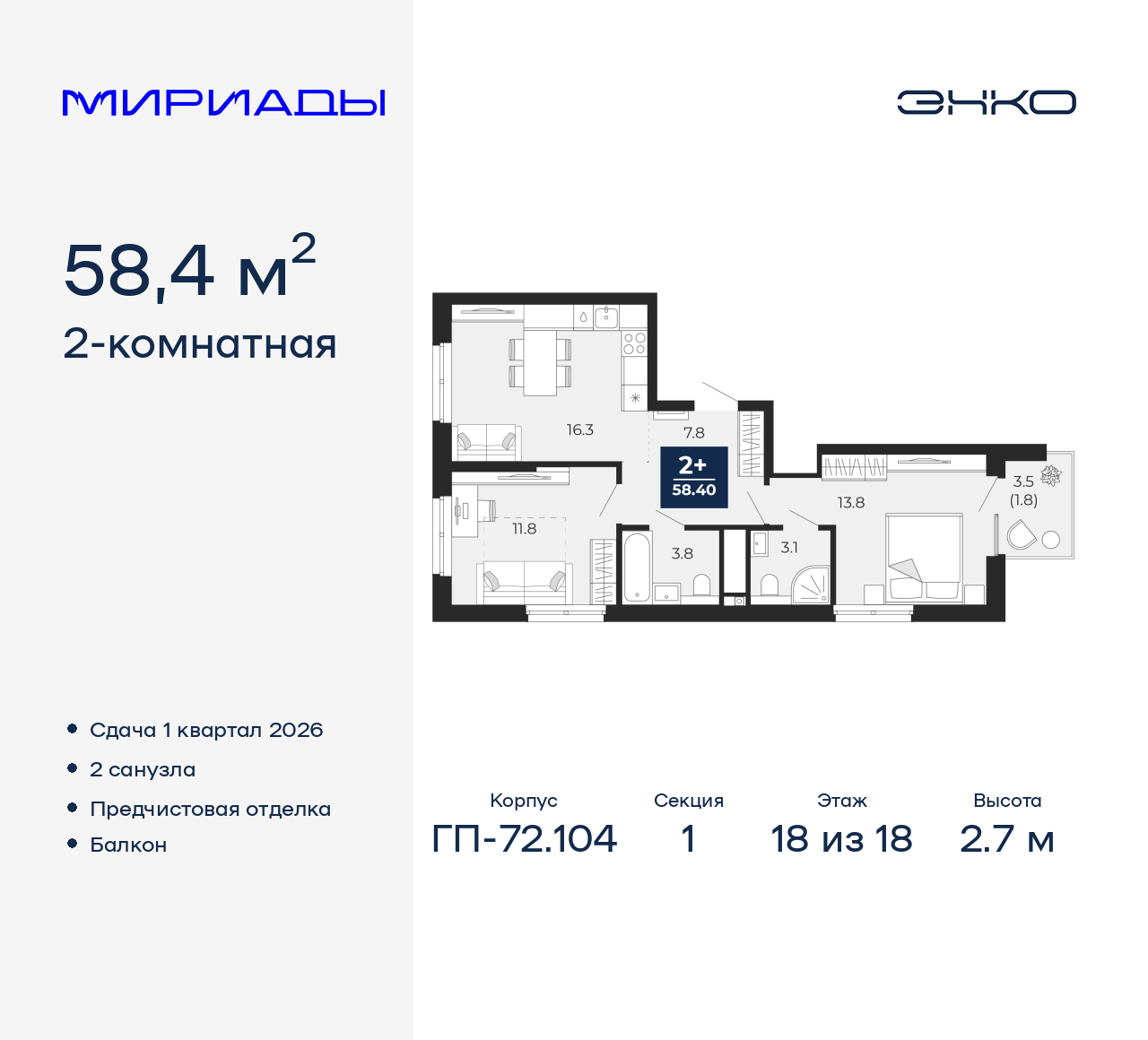 - Общая площадь 58.4 м²